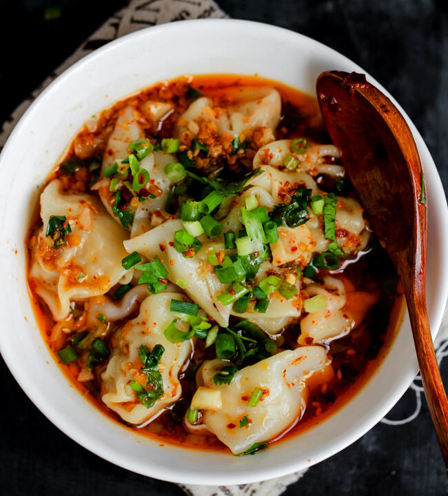 Yanxian-style red oil wonton with unique Yanxian-style red oil, black vinegar, soy sauce, and sesame oil. Plump pork wontons, dressed in minced garlic and ginger, and immersed in a rich red oil soup, make for an appetizer that will awaken your palate.