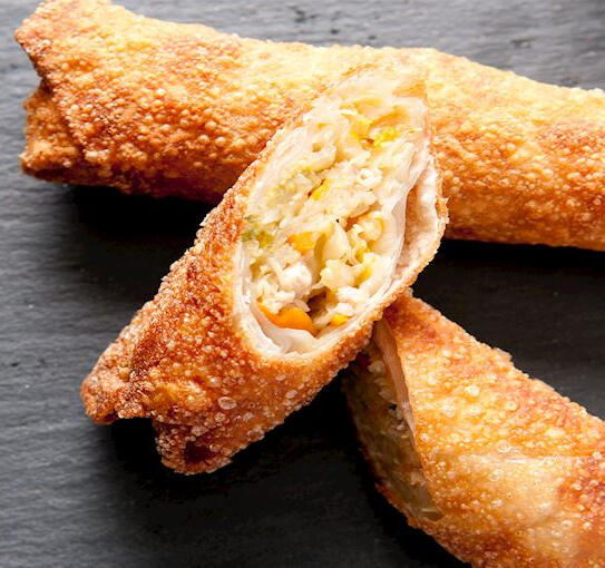 This is an amazingly crunchy appetizer. The filling is made with a mixture of minced pork and shrimp, chestnuts, scallions, and bamboo shoots, wrapped in nice crispy cabbage, and then covered in a fried egg and wheat flour shell for that satisfying crunch.