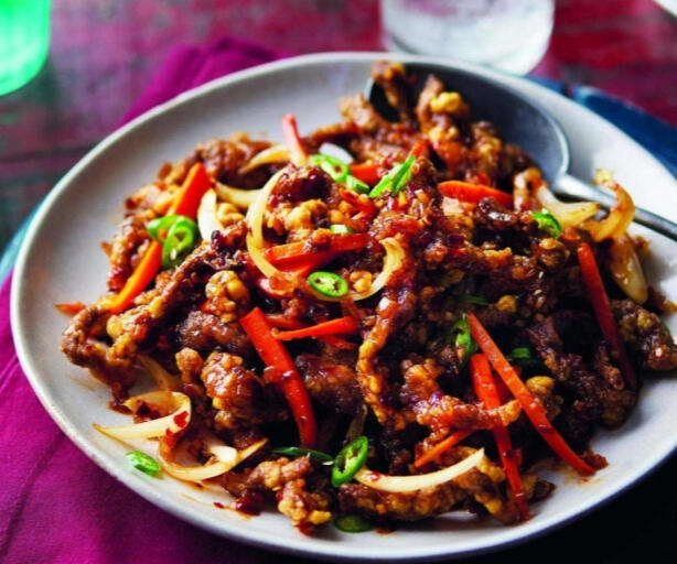 Yanxian Beef is a spicy and slightly sweet beef entree. After deep-frying the beef, it is combined with a yummy sauce and cooked just enough so that all the pieces are evenly coated. This dish is very spicy due to the chilies; every spice lover will instantly become hooked. Ginger, carrots, bell peppers, onions, and scallions help to enhance the flavors of this spicy dish.