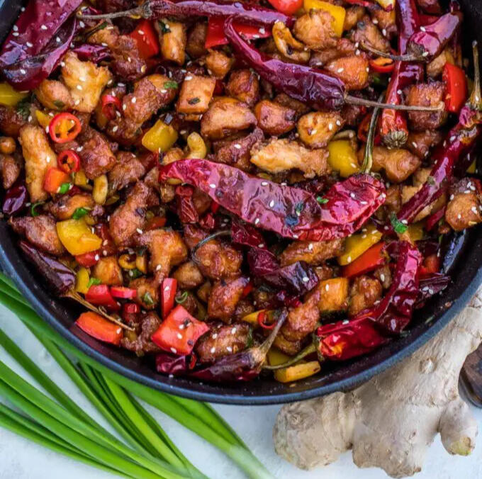 Delicious, delectable, and a cracker of a dish! Yanxian-style chili chicken is cooked with brown, green, and white peppercorns, along with Doman spices. A garlic-and-ginger base enhances the flavor, along with the potent kick of dried Yanxian chilies.