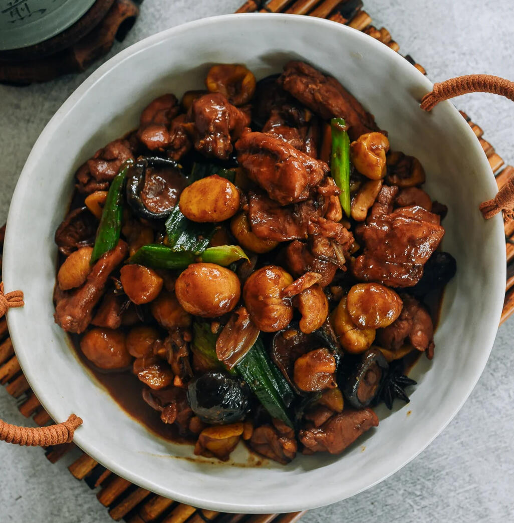 Tender chicken pieces slowly simmered in a richly aromatic broth, joined by buttery chestnuts and earthy shiitake mushrooms. The sauce glazes each bite with deep savory notes in a comforting, warm embrace — hearty, elegant, and deeply satisfying.