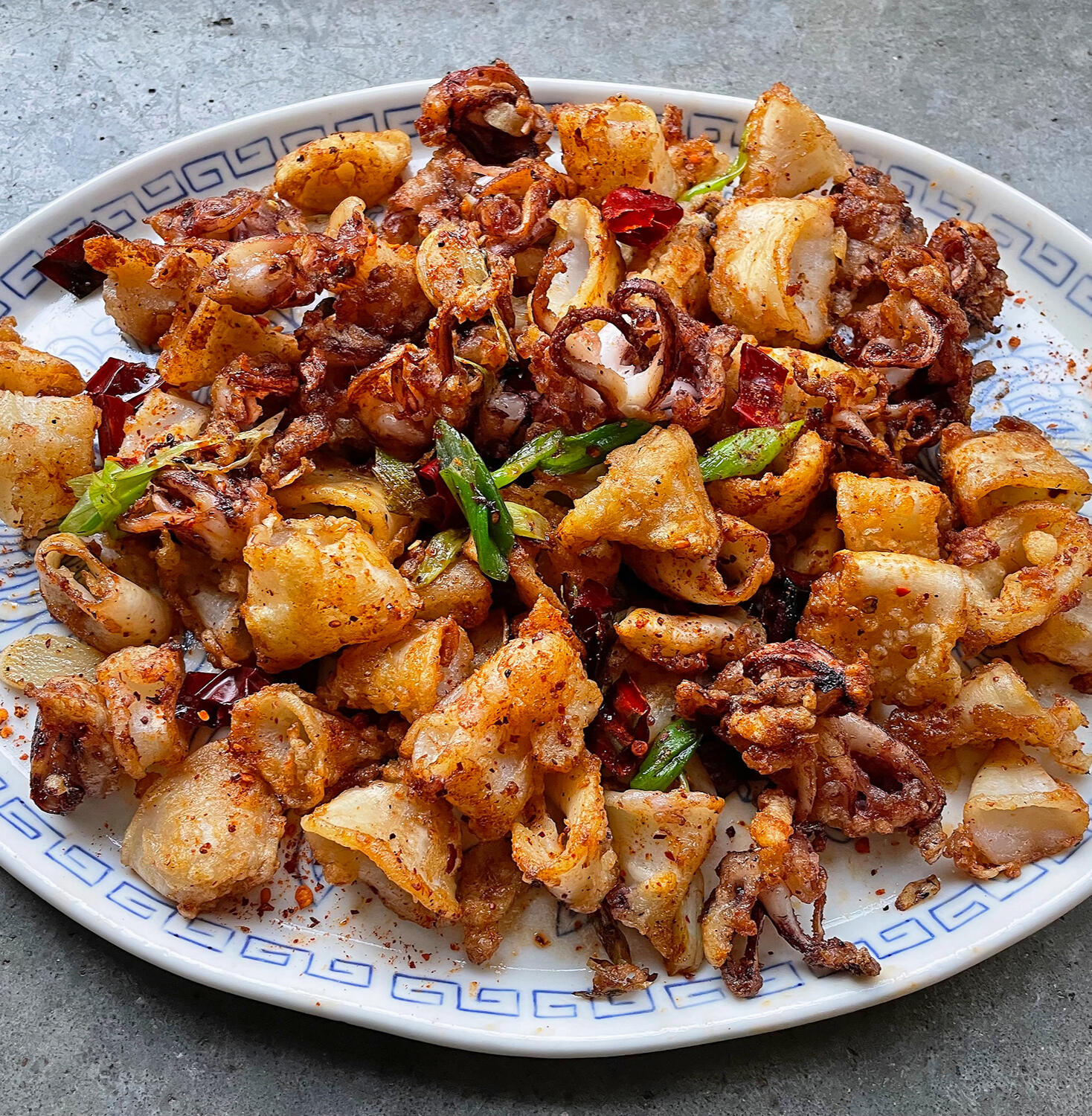 Salt-and-pepper squid, known as Youyu, is lightly battered and fried, then stir-fried with aromatics and a generous sprinkling of Jiaoyan, or pepper salt. It is paired with Yanxian dipping chilies, which elevate this dish with a spicy kick!