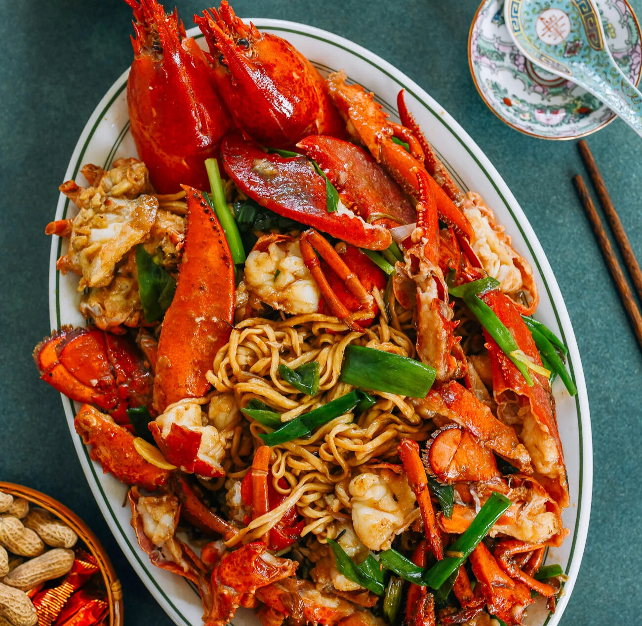 Luxurious, celebratory, and deeply satisfying. Succulent lobster pieces mingle with chewy, springy yee mein noodles (pre-fried before drying for resilience and texture), all coated in a silky, savory sauce of soy, oyster sauce, ginger, and scallions. The rich seafood sweetness and the bold umami sauce wrap each long strand and morsel in a warm, joyful embrace — the kind of dish made for banquets and special moments.