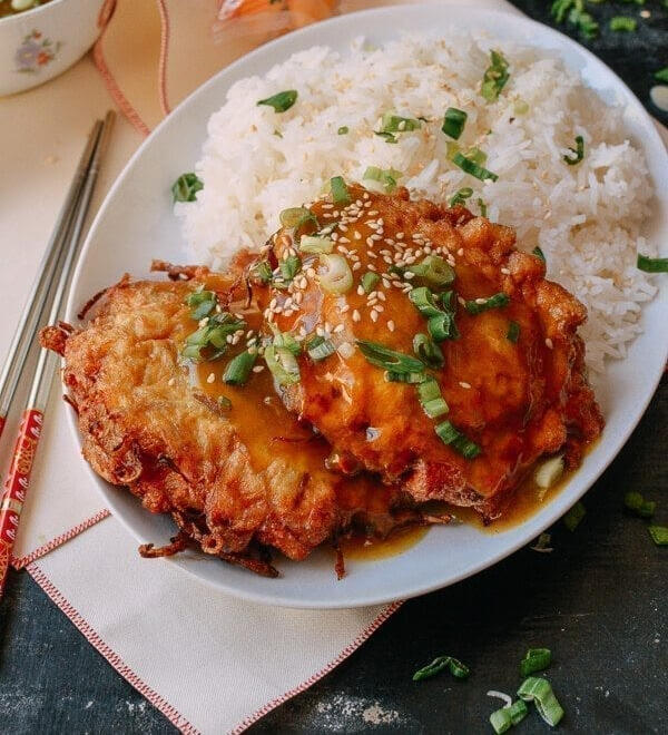 Succulent pork chops, pounded thin and soaked in a savory marinade, get a delicate egg coating and sear before being bathed in a sweet soy-scallion braise. The result is juicy, tender meat in a glossy, aromatic sauce, with scallions that are just as irresistible as the pork itself.