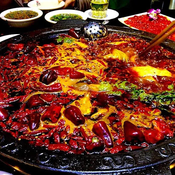 Spicy Soup Base: Beef Tallow/Fat, dried chili pepper & Sichuan pepper, scallions, onion, coriander, Sichuan chili bean paste & black bean paste, rice wine & rock sugar