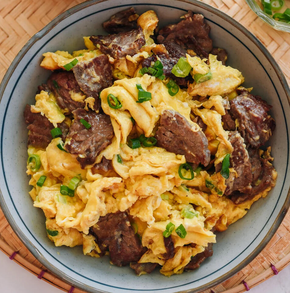 Tender, marinated slices of beef folded into soft, golden eggs, creating a silky, melt-in-your-mouth harmony. Lightly seasoned and gently sauced, this comforting classic delivers rich umami depth with a smooth, velvety finish — simple, elegant, and deeply satisfying.