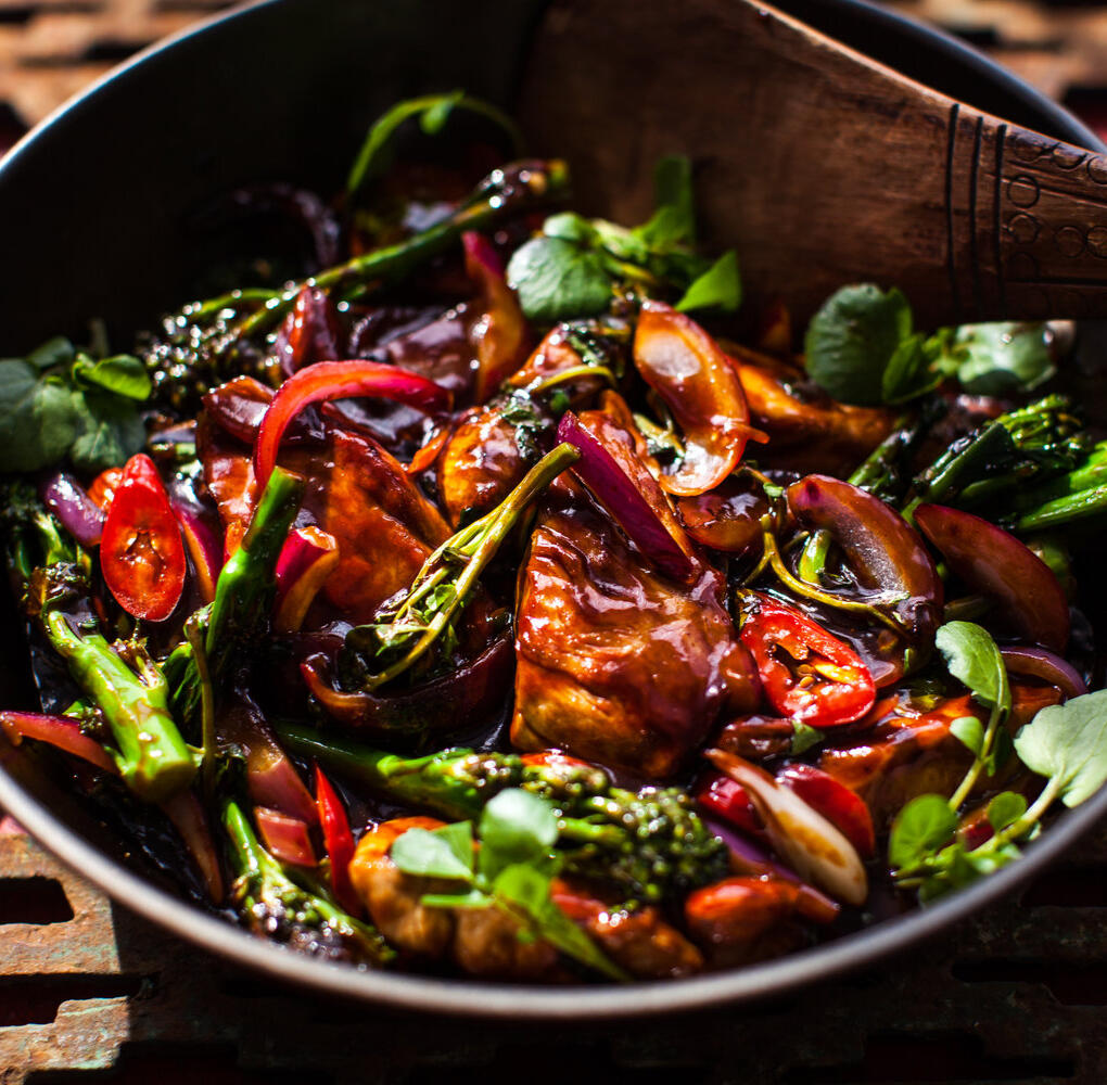 This spicy dish features pork tenderloin and fresh veggies. Watercress, broccoli, and roasted cashews accompany the dish. A thick but flavorful sauce with a bold depth of flavor really brings this dish together. The combination of textures and the kick of spice makes this an exciting dining experience!