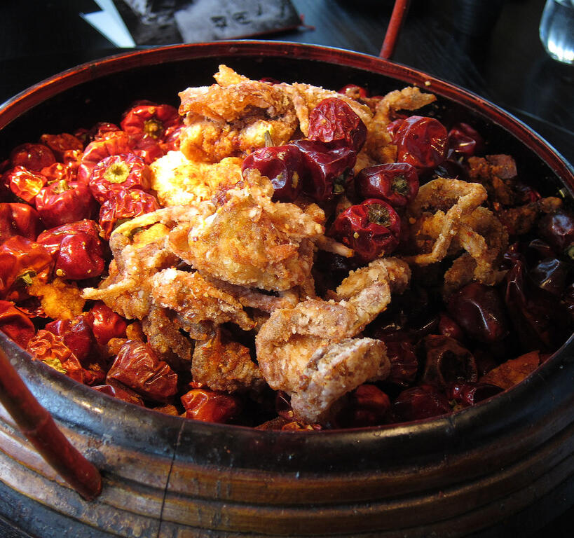 It's a secret family recipe. Soft-shell crab, lightly coated in a seasoned batter, is immersed in a blend of reconstituted sun-dried tomatoes, roasted red bell peppers, and finely chopped Yanxian chilies. This amazingly flavorful dish has that trademark mouth tingle and addictive crunch of the deep-fried softshell crab!