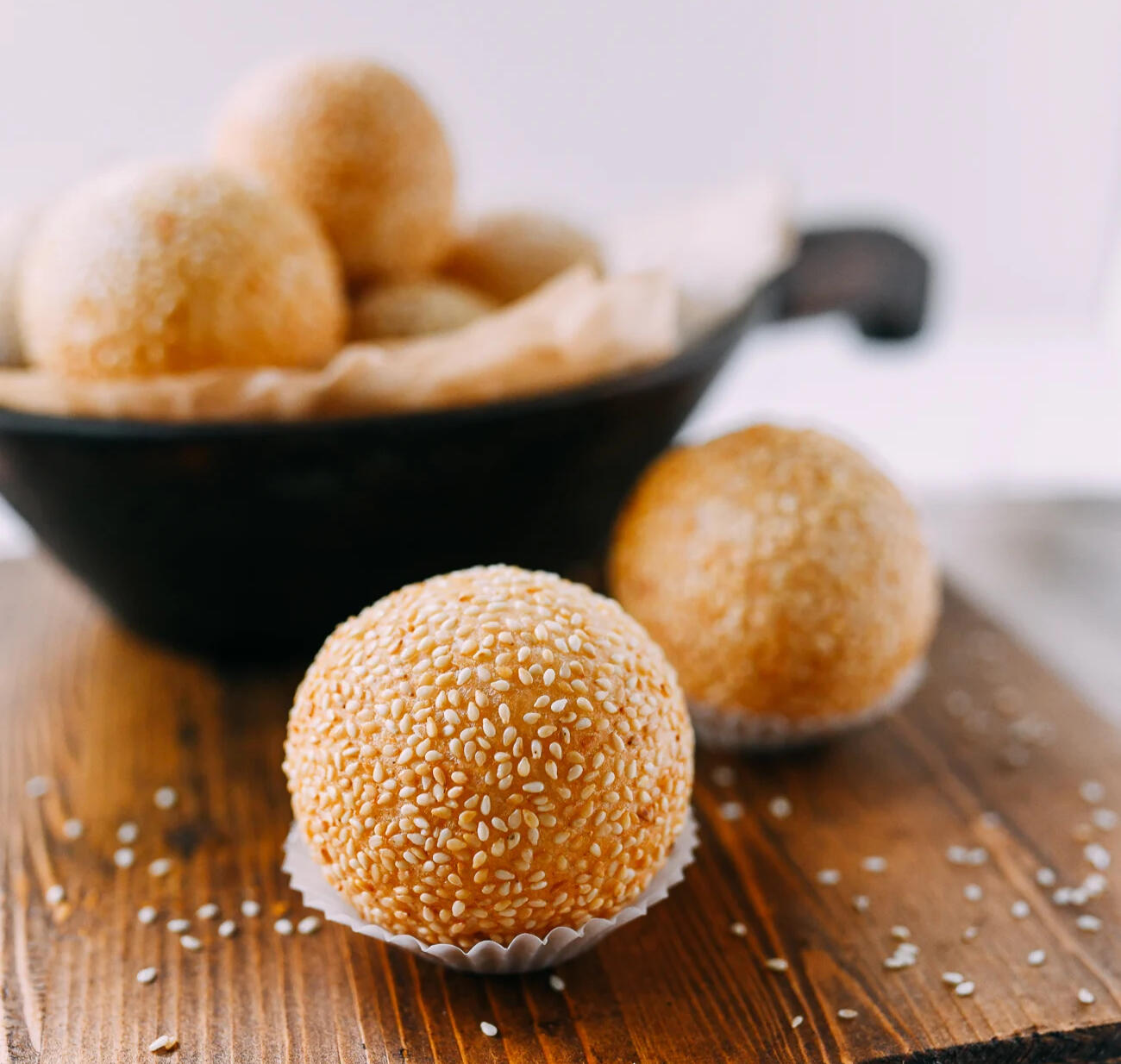 Crispy and golden on the outside, yet soft and chewy inside — these glutinous rice dough orbs are filled with a sweet lotus paste, rolled in sesame seeds, and deep-fried to perfection. They crackle lightly as you bite into them, revealing a tender, molten center that contrasts beautifully with the nutty, toasted sesame crust.