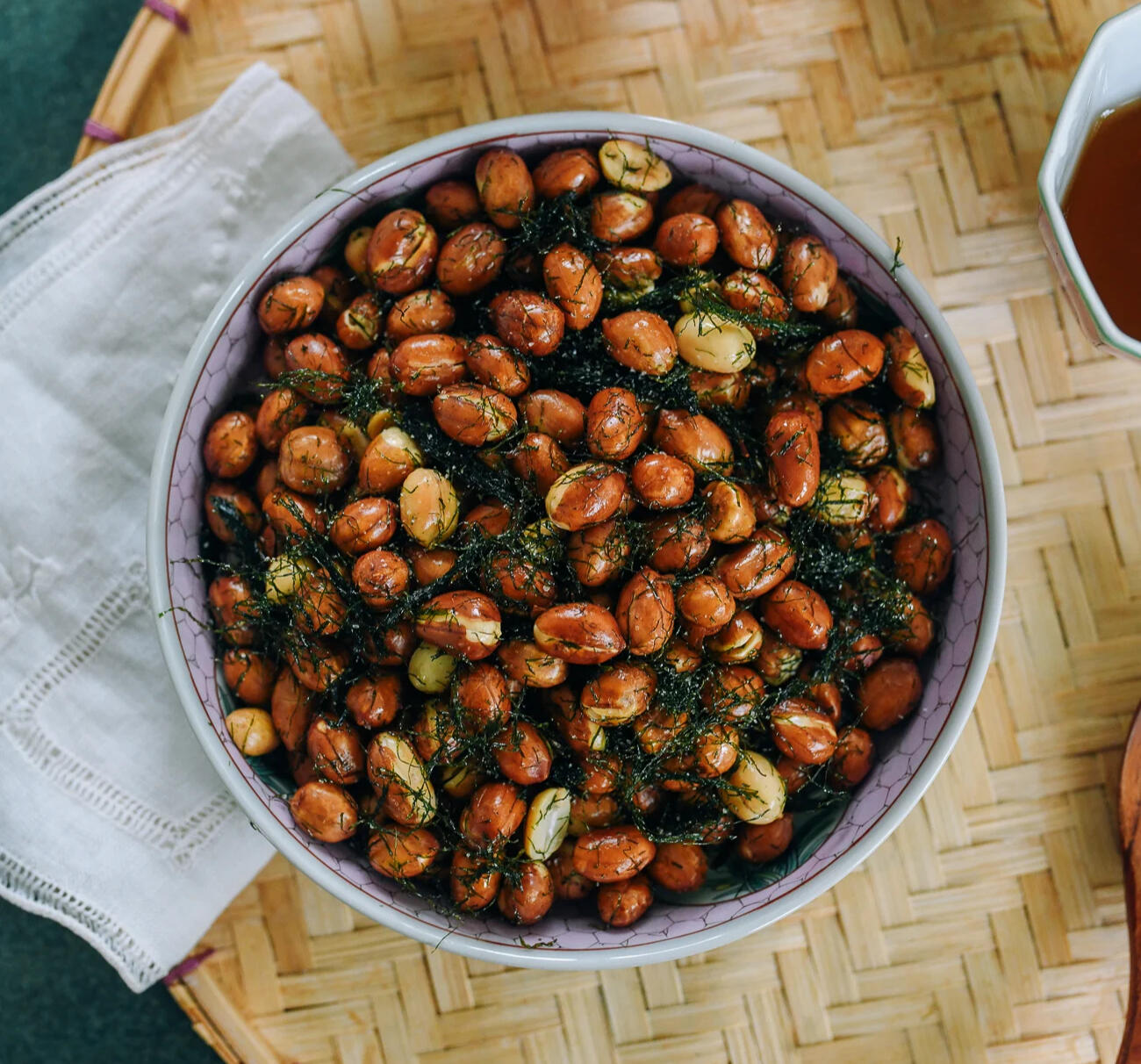 Crisp roasted peanuts mingle with airy strands of dried seaweed (tái tiáo), each bite delivering a satisfying crunch, a mineral tang of the sea, and a whisper of umami salt. The contrast of nutty richness and briny green makes it oddly addictive — snackable, light, and full of character.