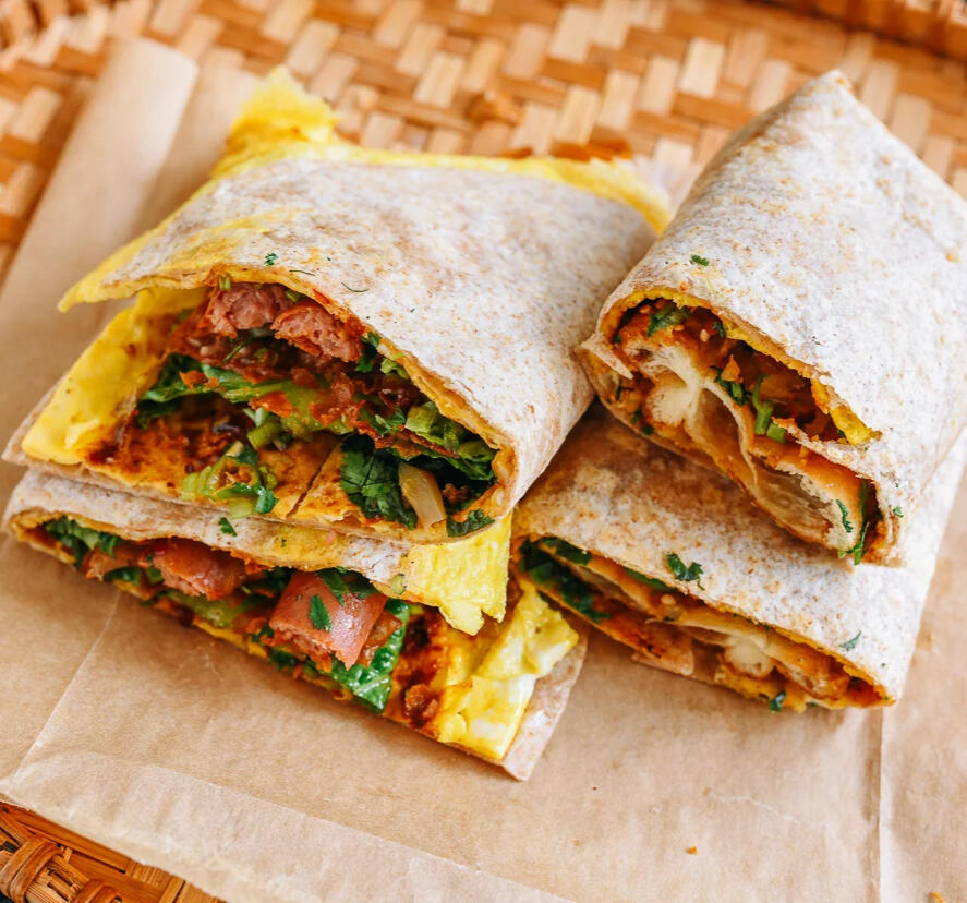A popular classic that highlights the flavor of Doman street food. In the classic version, a warm crepe is brushed with a soft egg layer, slathered with sweet bean and spicy sauces, sprinkled with sesame, scallions, and cilantro, and rolled around a crispy youtiao for a satisfying crunch.A more modern twist is made with zha cai, lettuce, fried wonton skin, and sliced pork sausage.