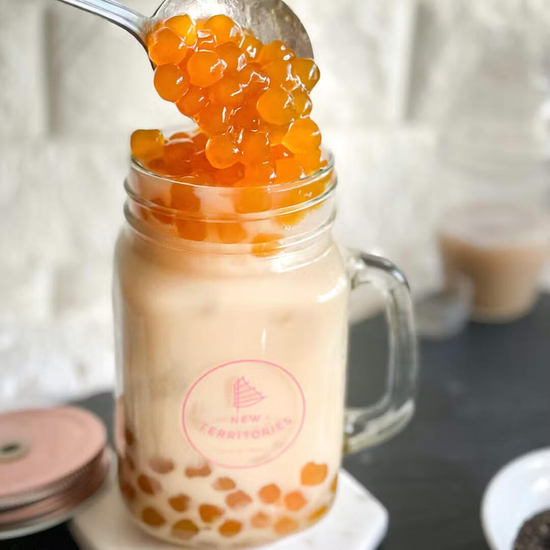 A light, floral oolong milk tea with a clean, refreshing finish, delicately creamy and softly fragrant with every sip. At the bottom, special “golden nugget” boba—crafted with sweet persimmon and bright Doman orange—adds a gentle fruitiness and a satisfyingly chewy bite. Fresh, elegant, and subtly indulgent, this auspicious drink is brewed to share prosperity, warmth, and good fortune in every golden sip.
